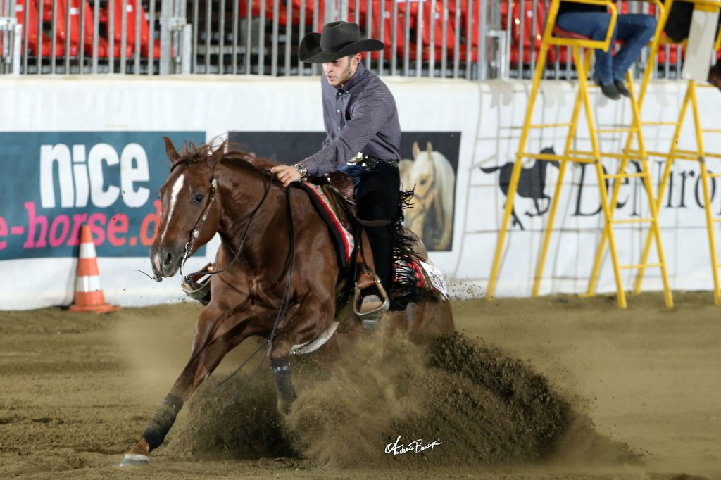 Ambrosini, 19 anni, lombardo purosangue, affianca il padre Pietro Paolo nella gestione dell’azienda di famiglia – specializzata nell’allevamento del bestiame – e con lui è portavoce della scuderia “top” Ambrosini QH. Nella stagione di gara 2018 è probabilmente il non pro che si è messo più in luce nelle arene europee, quando vittorie e piazze d’onore in quasi tutti i Futurity maggiori (e non solo) gli hanno fruttato l’ingresso nella Top 20 mondiale e oltre 76mila dollari di vincite in carriera. Con lui alla testa del go-round non pro level 4 c’è Gunnalittlestep (Gunnatrashya per Gay Jays Little Step), quattro anni, già terzo L3 e quarto L4 al Nrha European Futurity di aprile con Pietro Paolo. Nato presso Angelika e Markus Gebert, domato e addestrato all’Ambrosini Qh dove viene gestito da Marco Pettinari, nel 2018 lo ha esibito anche Rudi Kronsteiner.