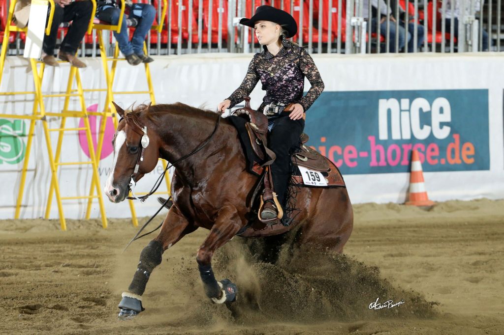 Un ex aequo anche alla testa del level 1, tra Vanessa Kock, amazzone di Amburgo, e Gilberto Bonzi che vive vicino a Bologna. Vanessa, mamma fresca di un bimbo di un anno, monta con suo marito Janto (che è stato allievo di Rudy Kronsteiner) nella loro scuderia privata, ma dallo scorso febbraio la coppia porta periodicamente i propri cavalli da gara presso il centro di Bernard e Ann Fonck ad Anversa: Ann infatti la sta seguendo anche in questo, che è il primissimo Special Event cui Vanessa partecipa. Monta da quando aveva 6 anni, ma è passata all’equitazione western e in particolare al reining solo nel 2015, quando ha potuto tornare in sella dopo un brutto incidente nel quale si era fratturata la seconda vertebra lombare e quasi non riusciva più nemmeno a più camminare. Vanessa ha dovuto portare un fissatore con tre barre e sei viti che è stato appunto rimosso nel 2015: «Da allora mi sono allenata ogni giorno per cercare di migliorare e Redneck (QT Red Dun)mi ha aiutato tantissimo. Lui è certamente il mio “one in a lifetime horse”». QT Red Dun (da Dun It On The QT e Moms Lil Ruffian), stallone di 7 anni, è stato acquistato quando ne aveva due presso i suoi allevatori Katja & Michael Jungfer Schubert: montato fino ai 5 da Janto, solo da un anno è passato tra le redini di Vanessa.