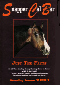 | Dam SHOT GUN SHEA QUARTER HORSE | Ex SNAPPIN SHEA 1995 QUARTER HORSE By SNAPPER CAL BAR ![]() NCHA $248,987 COA NCHA Non-Pro Futurity Champion NCHA Open Derby Co-Champion. Breeding Stallion in Italy. Sire of many Champions. Winning get include: 2003 Open Derby NRHA of Germany, 2003. 2004 Open + Non Pro Derby NRHA of Germany, 2004 Italian Open Futurity and many more. Deceased. |