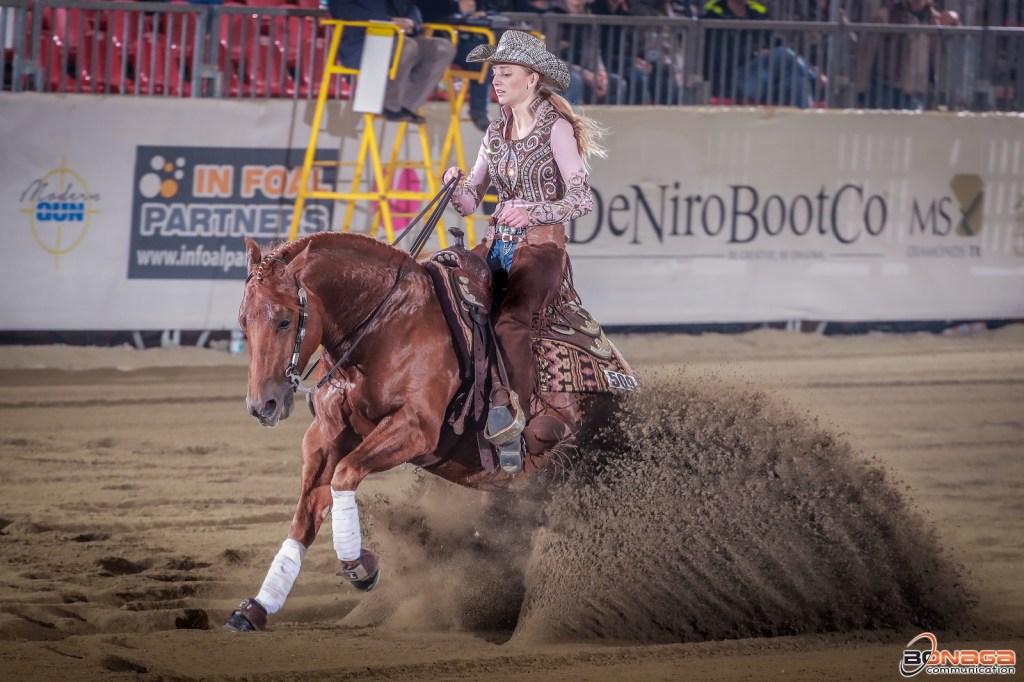 Negli ultimi due anni l’amazzone ventunenne è letteralmente esplosa come una delle più interessanti nuove presenze nelle arene del reining europeo, dove ha dimostrato di saper gestire cavalli di tutte le età con una professionalità da trainer maturo ponendosi come una presenza costante nelle parti alte delle classifiche level 2 e 1. Questa è però la sua prima vittoria in special event per un level 3. Con Arnels Spat Olena era anche stata Reserve Champion level 1 e terza nel level 3 al Futurity Belga lo scorso settembre.