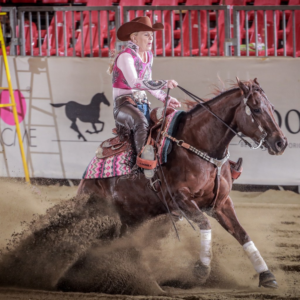 «Nelle finali vorrei semplicemente ripetere lo stesso go, questo è il mio obiettivo», aveva detto la tedesca Stephanie senza sbilanciarsi in sogni di gloria dopo aver assestato il top score nell’eliminatoria di venerdì scorso. Ed è quello che ha fatto. Ottenendo il 215,5 che le è bastato per riposizionarsi, ultima a entrare nella finale, come Nrha European Futurity e Irha/Nrha Futurity Non Pro L4 Champion. Con lei Smart Spook Surprise, una figlia del Nrha Six Million Dollar Sire Smart Spook e di Arc Honey Chick, allevata da Società Agricola Le Fattorie Di Matilde.