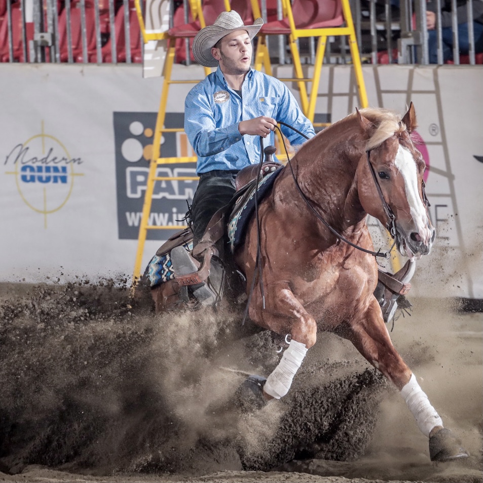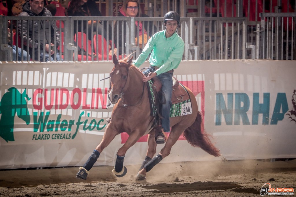 Achille, studente dell’istituto tecnico, monta per l’Associazione reining campana e abita a Castrocielo, in provincia di Frosinone. «Il mio trainer è mio padre Alessandro, che mi ha sempre seguito in prima persona con il supporto di trainer competenti e che mi ha impartito da subito un importante insegnamento, tecnica a parte: “Fai cose semplici e divertiti mentre gareggi”», spiega. «Ho iniziato all’età di otto anni al Torello Quarter Horse con Misha Olena Dun It, il cavallo che mi ha insegnato a stare in sella e con il quale ho vinto diverse classi regionali». Ora c’è El Bonny Whiz, figlio di Hesa Mega Whiz per Just Genolena, allevato da Francesco Prencipe e addestrato da Raffaele Colacicco e Luigi Castaldo. Già finalista Futurity 4YO Non Pro, terzo nel Campionato italiano a squadre Non Pro e con al suo attivo diverse vittorie anche nei Campionati regionali, Achille, che lo monta da un anno, definisce “poesia in movimento”, l’emozione che questo cavallo gli ha trasmesso durante gli spin e gli stop della Finale: «La rifarei esattamente uguale», conclude, felice della sua giornata.