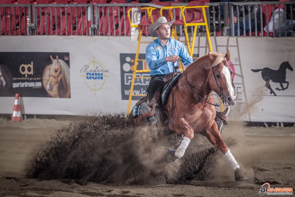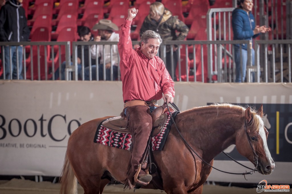 Quattordici i partenti nelle finali Novice Horse Open e un gran bel punteggio per vincerle: 146. Lo hanno messo a segno Mattia Nadalini e Theogoodtrip. Il bravo stallone non fa a tempo a godersi l’illusione del meritato riposo dopo la gara, che a stretto giro rientra in arena sotto la sella del suo proprietario Gianmario Mandaletti per battersi anche nella finale Novice Horse Non Pro, dove i contendenti sono 18. E vincere anche quella, questa volta con uno score di 140. Fatica terminata? Nemmeno per sogno: i 140 sono ben tre. Ci sono anche quello di Eleonora Panunzi su Master Jack Sparrow e di Vittorio Legati con Xtra Pistolforwimpy. E allora run-off, e per Theo il terzo go di fila, alternando le pressioni di una mano open come quella di Nadalini alle diverse esigenze di un Non Pro come Mandaletti. Imperturbabile, Theo piazza sul cartellino dei giudici un 142 perfino migliorativo rispetto al primo score. E va a podio. Si può chiedere di più a un cavallo?