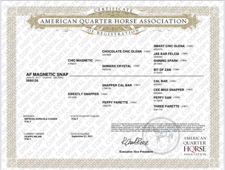 | By SNAPPER CAL BAR b 1981 QUARTER HORSE #1748109 NCHA $248,987 COA NCHA Non-Pro Futurity Champion NCHA Open Derby Co-Champion. Breeding Stallion in Italy. Sire of many Champions. Winning get include: 2003 Open Derby NRHA of Germany, 2003. 2004 Open + Non Pro Derby NRHA of Germany, 2004 Italian Open Futurity and many more. Deceased. | |