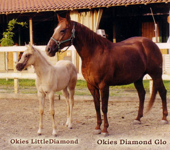 | Dam SP EXTASY OKIES ch 1995 QUARTER HORSE dam of: Cody B Okies Pride – with several reining medals , 2 ROM i AQHA reining at 4 years old | Ex OKIES DIAMOND GLO ![]() sor 1983 QUARTER HORSE Breeder: Jack Brainard, USA. Owner: Simone Guerra, Italy. Stand 7/2004, Gets LTE 4,558$ NRHA, 1987 ROM Performance |