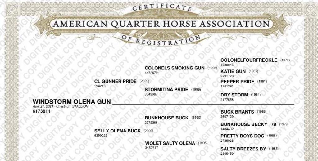 | Dam SELLY OLENA BUCK 2009 QUARTER HORSE | Ex VIOLET SALTY OLENA 1995 QUARTER HORSE Grandgranddaughter of DOC OLENA ![]() H-0, P-2 1970 NCHA Futurity Champion. NCHA LTE: $21,991.93. A Leading Sire and Leading Maternal Grandsire NCHA Money Earners. AQHA Hall Of Fame. Sire Of Multiple NCHA Hall Of Fame |