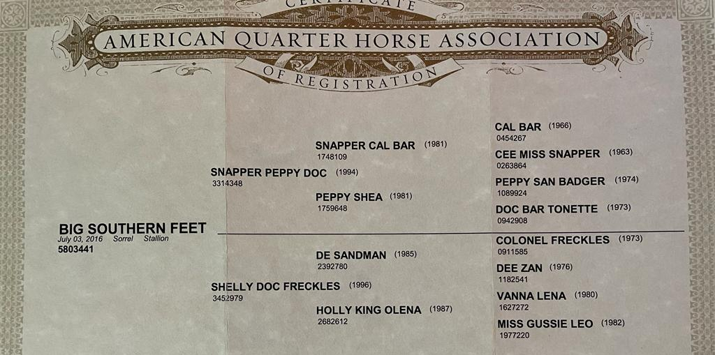 | Sire SNAPPER PEPPY DOC ![]() 1994 QUARTER HORSE | By SNAPPER CAL BAR ![]() b 1981 QUARTER HORSEAQHA#1748109 NCHA $248,987 COA NCHA Non-Pro Futurity Champion NCHA Open Derby Co-Champion. Breeding Stallion in Italy. Sire of many Champions. Winning get include: 2003 Open Derby NRHA of Germany, 2003. 2004 Open + Non Pro Derby NRHA of Germany, 2004 Italian Open Futurity and many more. Deceased. |
