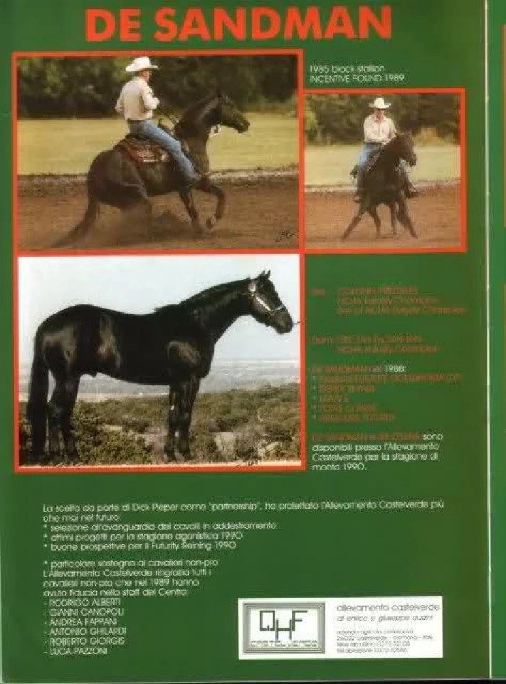 | By DE SANDMAN ![]() blk 15.0 H 1985 QUARTER HORSEAQHA# 2392780 Standing at Giuseppe Quaini Stable Final Futurity 1988 Ocklahoma City Derby St. Paul Leazy B. Texas Classic Armoure Futurity | |