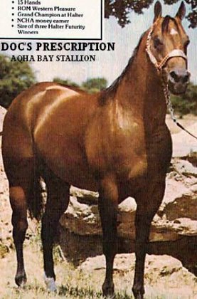 | By TOMMYS PREDICTION Champion Open Division, NRHA Farnum Futurity 1986 at AQHA Congress. $25,000 won. Granson of DOCS PRESCRIPTION ![]() Doc’s Prescription (not to be confused with DOCS PRESCRIPTION (mare) #3058397) Star/L.Hind Sock AQHA Show H-9/P-16 ROM Western Pleasure AQHA Champion NCHA $106.95 NCHA Offspring LTE $2,029,014.94 Sire of Blue Boy Doc, World Champion Sire, and Shy Prescription. | |