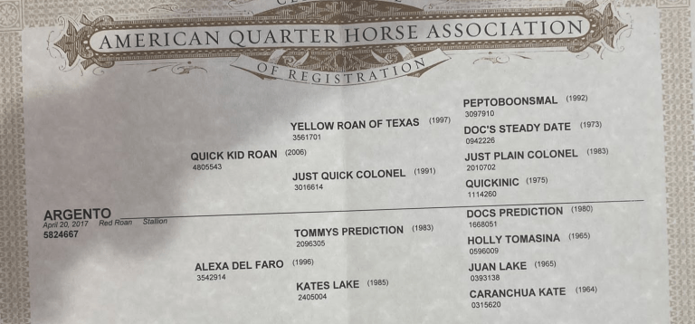 | Dam ALEXA DEL FARO 1996 QUARTER HORSE | Ex KATES LAKE br 1985 QUARTER HORSE Granddaughter of MR KLEBERG ![]() AQHA H-5/P-0 100% Foundation Sire of 90 AQHA foals from 8 crops registered from 1960-1967 before being gelded. |