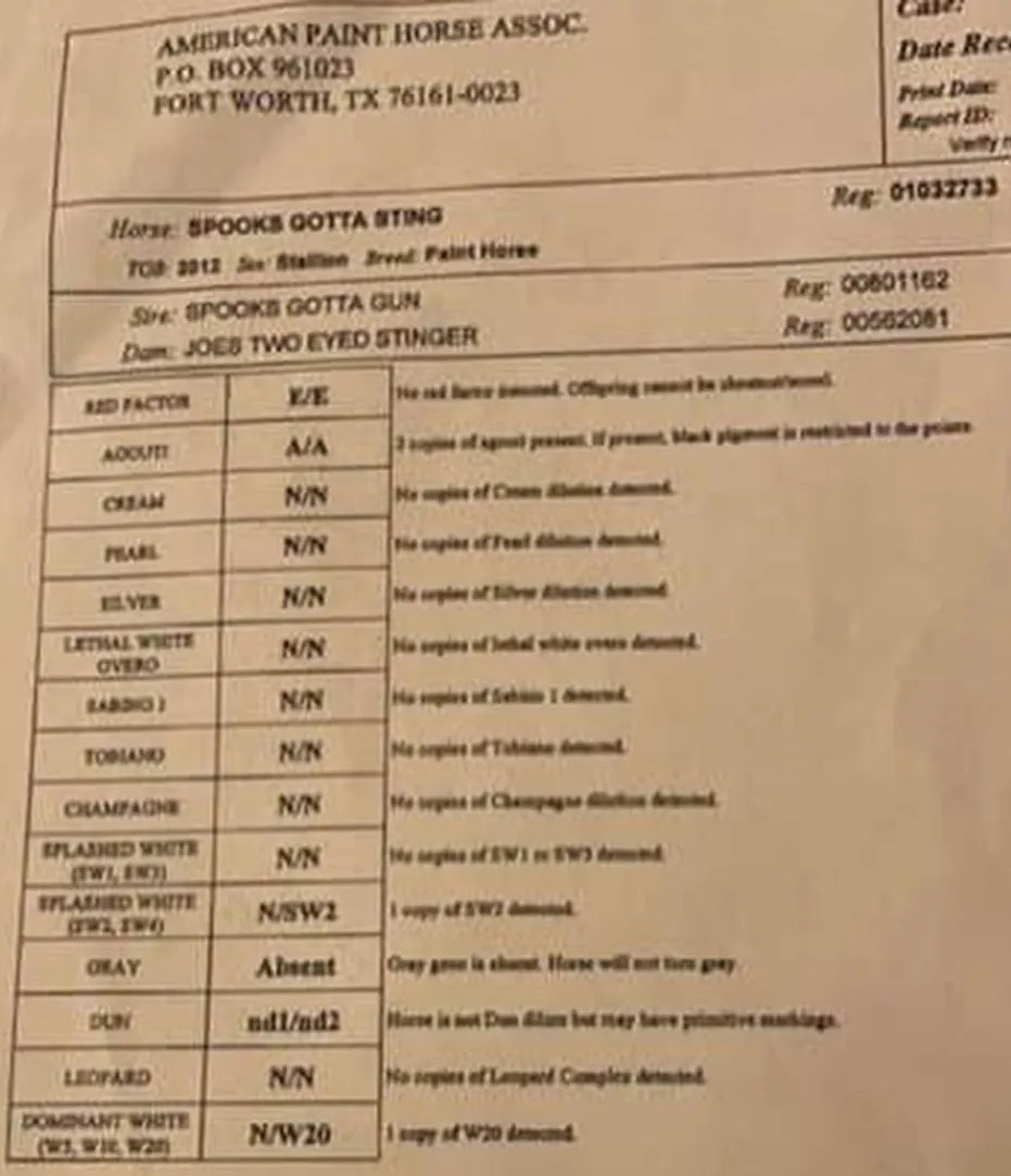| Sire SPOOKS GOTTA GUN ![]() 3 Million Dollar Sire b ov 14.3H 2002 QUARTER HORSE3 Million Dollar Sire AQHA # 4278968 APHA-00801162 Splash White/Bald Face/Deaf/4 Long Stockings/White Tail Color Tested: AA Ee nd1/nd2 N/W20 N/SW1 N/SW2 Sb1 N/N Genetic Tested: HERDA N/N, GBED N/N, HYPP N/N, PSSM1 N/N, MH N/N, LWO N/N, IMM N/N APHA Show H-0/P-33 APHA ROM Reining(Open) LTE $81,638 2008 Reining By The Bay $25,000 Open Derby Ch 2008 Las Vegas Reining Classic Derby Res.Ch 2008 Rancho Murietta Spectacular Derby Res.Ch 2008 MEC Derby 4,5,6YO Open Ch 2007 APHA World Jr Ch 2006 All American Reining Classic-3rd 4,5,6YO Open and Intermediate Open-Finalist 2006 Texas Cowboy Capital Classic Reining Novice Open Ch 2005 APHA World Show 3-Year-Old Open Reining Challenge-4th 2005 Southwest Open Reining Futurity-Top 10(Co-Res Champ in the First Go Finalist) 2005 Rocky Mountain Reining Summer Slide Futurity 3YO Open-Finalist through 2019: 336 APHA foals, 166 overo, 153 solid | By GRAYS STARLIGHT ![]() sor 14.2 1984 QUARTER HORSE#2405900 NRCHA Hall of Fame $48,160 earnings Offspring earnings exceed $10,000,000 NRHA Million Dollar Sire Full brother to Gallo Del Cielo; Paddys Irish Whiskey NCHA bronze award NRCHA #9 All-Time Leading Sire NCHA #11 All-Time Leading Cutting Sire AQHA Leading Sire Contracted West Nile Virus while at the Polo Ranch and had to be euthanized. |