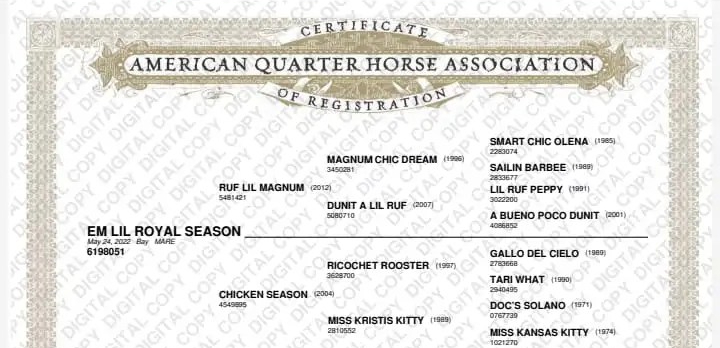 | Dam CHICKEN SEASON QUARTER HORSE | Ex MISS KRISTIS KITTY sor 1989 QUARTER HORSE #2810552 By DOCS SOLANO Sire record: Total Points Earned: 2,352.5; Reg Foals: 738; Number Shown: 332; Point Earners: 157; Halter Points Earned: 44; Halter Point Earners: 12; Performance Points Earned: 2,308.5; Performance Point Earners: 211; Performance ROMS: 59; Superior Performance Awards: 7; AQHA Champions: 1; Total Superior Awards: 7; Total ROMs: 59; World Championships: 3; Res World Championships: 4; High Point Wins: 1; NRHA Offspr LTE: $72,214 Number of NRHA Offspr: 21 NRHA Offspr Avg Earnings: $3,439 Equi-Stat Cutting Offspring LTE: $3,488,995 Number of NCHA Offspr: 226 AQHA Offspr NCHA LTE: $2,913,926 75% NFQHA |