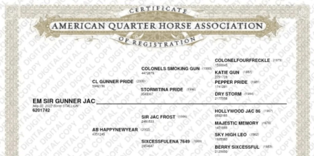 | Dam AB HAPPYNEWYEAR 2002 QUARTER HORSE | Ex SIXCESSFULENA 1989 QUARTER HORSE By SKY HIGH LEO ![]() SIRE OF: Reining, Cutting and Reined Cow Horse Futurity Finalists, Champions & Reserve Champions, AQHA World Show Qualifiers, AQHA Register of Merit producer |