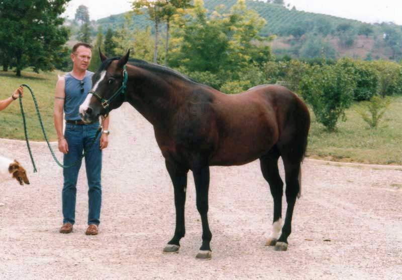 | Dam MISS SNAPPERINA 1992 ITALIAN SPORT HORSE | Ex BRIO DEL MASO 1986 Granddaughter of BOSTON MAC ![]() Superior Halter (1972-Open); Race Winner; $24,279; SI-91; Superior Halter-43 Halter Wins; 90.0 Halter Points; 1 Halter Superior Award; 35 Grand Championships; 7 Reserve Grand Championships. BOSTON MAC is the Grand sire of 3,112 Foals of which 717 were Performers. Performance of these Foals: 50 Race Winners; Total Race Earnings $419,902. Earned: 4,697 Performance Wins; 12,368.5 Performance Points; 2,912 Halter Wins; 2,977.5 Halter Points; 1,691 Novice Wins; 3,515.0 Novice Points; 202 Performance Register of Merits; 6 World Championships; 18 Halter Superior Awards; 73 Performance Superior Awards; 8 AQHA Championships; 4 Performance Championships; 5 Reserve World Championships; 1,018 Grand Championships; 1,163 Reserve Grand Champs. |