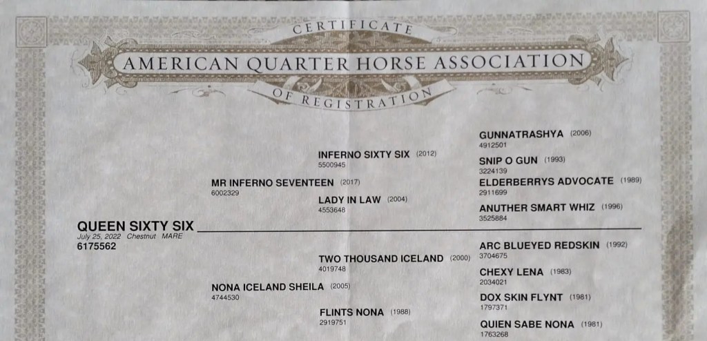 | Dam NONA ICELAND SHEILA ![]() QUARTER HORSE | Ex FLINTS NONA QUARTER HORSE Granddaughter of FRECKLES FLYNT ![]() NCHA $6,780.14, COA AQHA Offspring Record for Freckles Flynt Total Points Earned: 143; Reg Foals: 122; Number Shown: 38; Point Earners: 17; Performance Points Earned: 143; Performance Point Earners: 20; Performance ROMS: 7; World Championships: 2; Total ROMs: 7 Equi-Stat Cutting Offspring LTE: $232,901 Number of NCHA Offspring: 29 Avg Offspr CUT Earnings: $8,031 AQHA Offspring NCHA LTE: $103,282 |