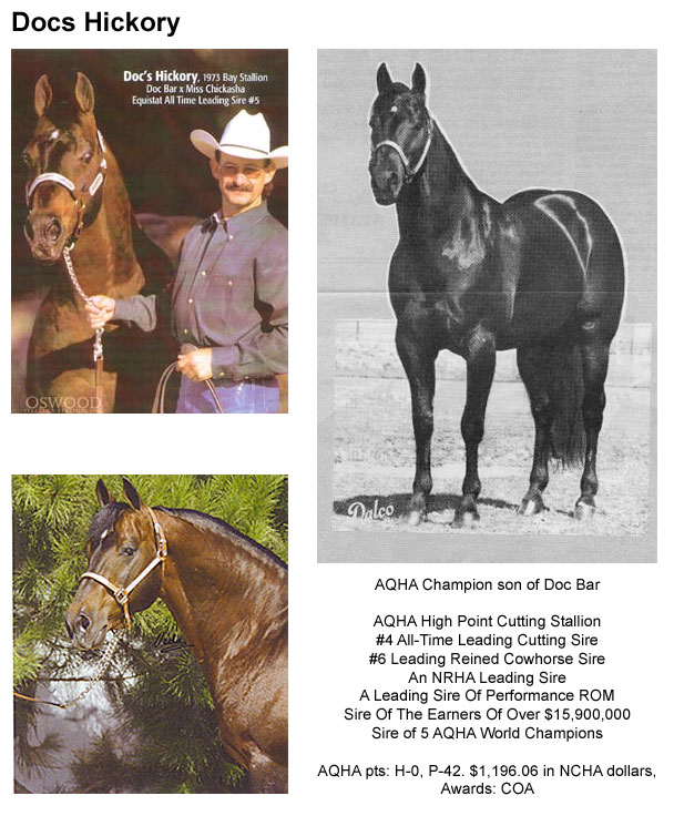 | Ex LEMACS LITTLE GIRL b 1994 QUARTER HORSE By DOCS HICKORY ![]() Doc’s Hickory foaled 02/13/1973 Star AQHA Show H-0/P-42 ROM Performance NCHA $1,196.06 NCHA COA AQHA High Point Performance Horse AQHA Reserve High Point Performance Horse Sired 5 AQHA World Champions, LTE $19,060,000+ 87.5% FQH | |