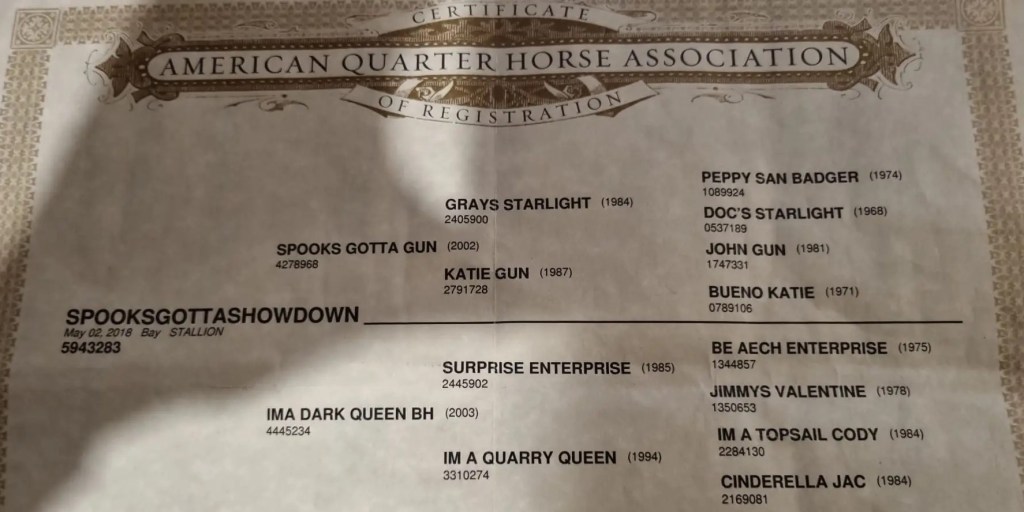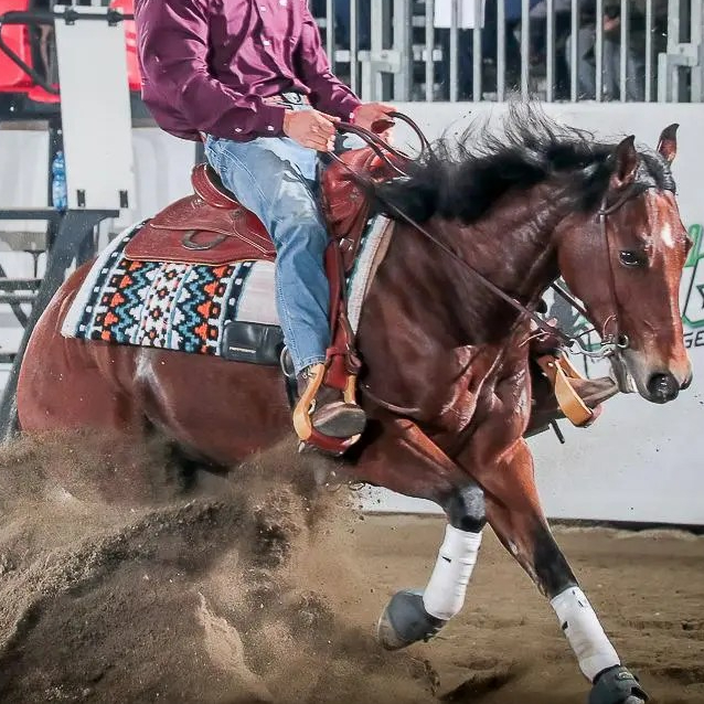 | Sire SPOOKS GOTTA GUN ![]() b ov 14.3 2002 QUARTER HORSEAQHA #4278968 3 Million Dollar Sire Double registered AQHA#4278968/APHA#00801162 Splash White/Bald Face/Deaf/4 Long Stockings/White Tail Color Tested: A/A, E/e, nd1/nd2, N/W20, N/SW1, N/SW2, LWO N/N, Sb1 N/N Genetic Tested: HERDA N/N, GBED N/N, HYPP N/N, PSSM1 N/N, MH N/N, IMM N/N APHA Show H-0/P-33 APHA ROM Reining(Open) LTE $81,638 2008 Reining By The Bay $25,000 Open Derby Ch 2008 Las Vegas Reining Classic Derby Res.Ch 2008 Rancho Murietta Spectacular Derby Res.Ch 2008 MEC Derby 4,5,6YO Open Ch 2007 APHA World Jr Ch 2006 All American Reining Classic-3rd 4,5,6YO Open and Intermediate Open-Finalist 2006 Texas Cowboy Capital Classic Reining Novice Open Ch 2005 APHA World Show 3-Year-Old Open Reining Challenge-4th 2005 Southwest Open Reining Futurity-Top 10(Co-Res Champ in the First Go Finalist) 2005 Rocky Mountain Reining Summer Slide Futurity 3YO Open-Finalist through 2019: 336 APHA foals, 166 overo, 153 solid deceased 11/2023^ | By GRAYS STARLIGHT ![]() sor 14.2 1984 QUARTER HORSE #2405900 NRCHA Hall of Fame $48,160 earnings Offspring earnings exceed $10,000,000 NRHA Million Dollar Sire Full brother to Gallo Del Cielo; Paddys Irish Whiskey NCHA bronze award NRCHA #9 All-Time Leading Sire NCHA #11 All-Time Leading Cutting Sire AQHA Leading Sire Contracted West Nile Virus while at the Polo Ranch and had to be euthanized. |