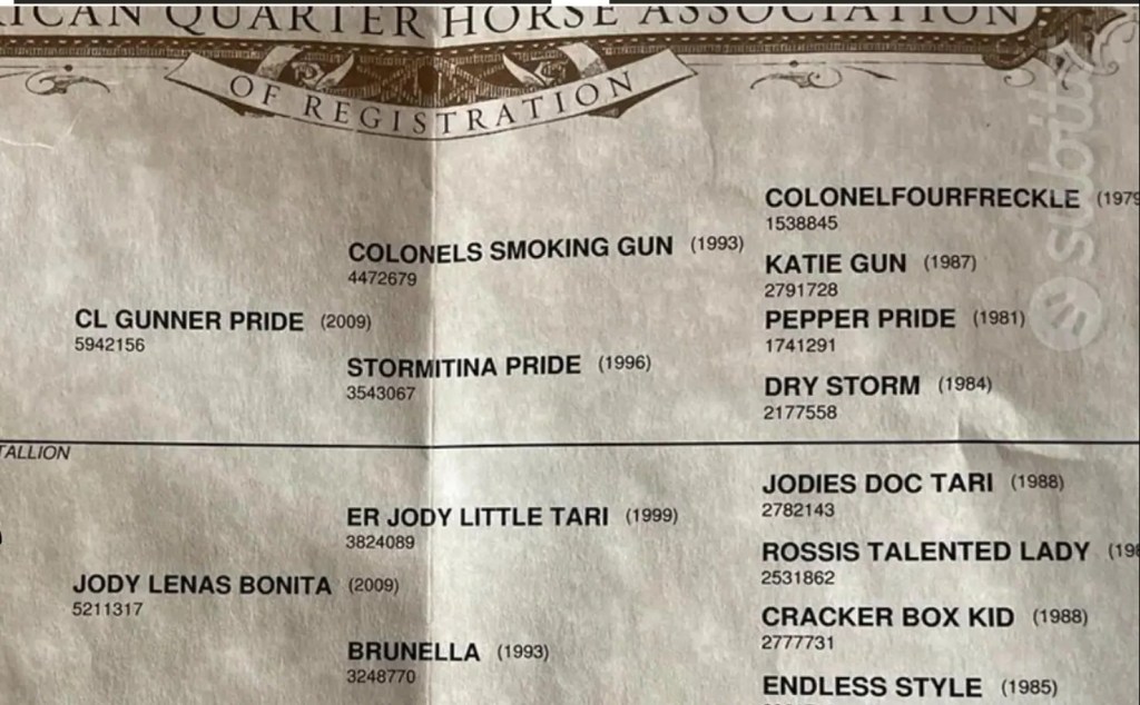 | Dam JODY LENAS BONITA ![]() 2009 QUARTER HORSE | Ex BRUNELLA QUARTER HORSE Granddaughter of LENAS BONITA ![]() LENA’S BONITA AQHA Show H-0/P-17 ROM Cutting NCHA $3,962.10 NCHA COA-Bronze, Silver 1976 NCHA Derby Champion He was housed at the University Farm (Truman State University) until he was put to sleep in July of 1996. |