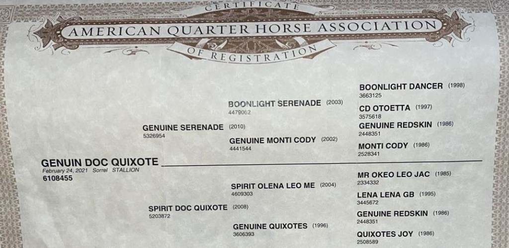 | Dam SPIRIT DOC QUIXOTE ![]() 2008 QUARTER HORSE | Ex GENUINE QUIXOTES QUARTER HORSE By GENUINE REDSKIN ![]() LTE $34,866 AQHA Congress 1989 – OPEN Reserve Champion Lazy E – OPEN Finalist NRHA Derby 1990 – OPEN Champion (Bob Loomis), ANCR Special Events & Major Events Champion’s Sire |