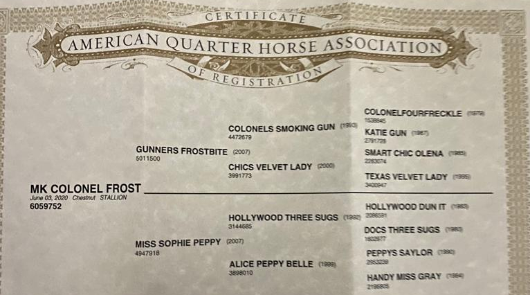 | Dam MISS SOPHIE PEPPY 2007 QUARTER HORSE | Ex ALICE PEPPY BELLE 1999 QUARTER HORSE |