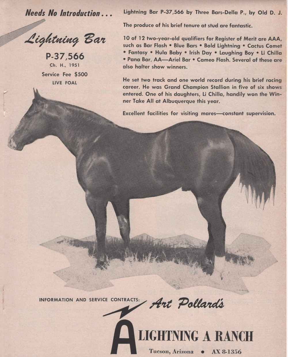 | Sire DOC OLENA ![]() b 1967 QUARTER HORSE #0493297 H-0, P-2 1970 NCHA Futurity Champion. NCHA LTE: $21,991.93. A Leading Sire and Leading Maternal Grandsire NCHA Money Earners. AQHA Hall Of Fame. Sire Of Multiple NCHA Hall Of Fame. | By DOC BAR ch 14.2 1956 QUARTER HORSE #0076136 AQHA Show H-36/P-0 ROM Halter AQHA Race SI:75/A, 4-0-0-1, $95. Leading sire of AQHA Champions, NCHA Champions, and Arena ROMs. Offspring earned $1,178,484 in cutting. SIRE OF: 487 foals, 1960-1978. 323 performing foals. World Ch 9, Reserve World Ch 4, Top Ten World Show Offspring, Superior Halter. AQHA Hall of Fame Doc Bar was humanely put down on July 20, 1992. He was 36 yrs old. By LIGHTNING BAR ![]() |