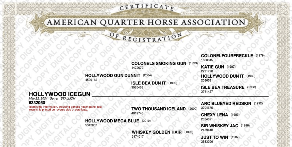 | Dam HOLLYWOOD MEGA BLUE ![]() pal 2010 QUARTER HORSE | Ex WHISKEY GOLDEN HAIR 1993 QUARTER HORSE Granddaughter of HOLLYWOOD JAC 86 ![]() 88% NFQHA 100% FQHA P-80 NRHA World Champion (1974 & 1975 Non-Pro) Top Ten World Show (1974 Reining) Superior Performance (1974 Reining NRHA $6,090. ROM Performance NRHA HALL OF FAME NRHA $1 million sire #1 All Age/All Division Leading NRHA Paternal and Maternal Grandsire Breeder: John & Mary Bowling, Sumner, Ia. died 1991 http://www.fqha.com/articles/100percentfoundationstallions.htm https://www.westernhorseman.com/article/flashbacks/3029-hollywood-jac-86 |