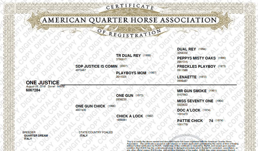| Sire SDP JUSTICE IS COMIN ![]() sor 14.2 2007 QUARTER HORSE AQHA # 4973467 Drha Futurity Open Champion, Tradition Futurity Open Champion, Congress Futurity Open Champion | By TR DUAL REY ![]() sor 14.3 1999 QUARTER HORSE #3795517 Star LTE:$353,174 2008 AQHA Freshman Sire of the Year 2002 NCHA Fut. Open Semi-Finalist 2003 Augusta D. Open Finalist-5th 2003 Memphis D. Open Res.Champ 2003 Suncoast Winter D. Open Champ 2003 NCHA Super Stakes D. Open Res.Champ 2003 NCHA Super Stakes Stallion Incentive Champ 2003 Breeders Invitational D. Open Finalist 2003 NCHA D. Open Res.Champ 2003 Brazos Bash D. Open Finalist 2003 Suncoast D. Open Finalist-6th 2003 PCCHA D. Open Res.Champ 2003 Great American Open Champ 2003 LEADING MONEY EARNER 2004 Abilene Classic Open Finalist-5th 2004 Augusta Classic Open Finalist-4th 2004 Western Horseman Cup Open Res.Champion 2004 Memphis Classic Open Finalist-7th HYPP N/N, PSSM1 N/N, MH N/N, HERDA N/N, GBED N/Gb |