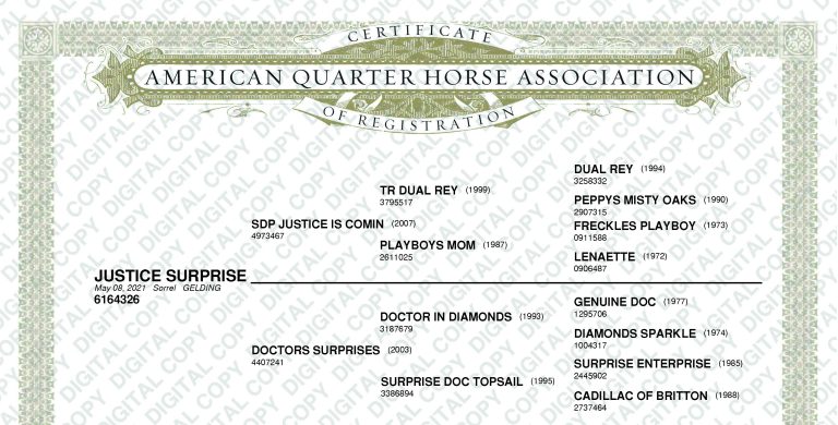 | Sire SDP JUSTICE IS COMIN ![]() sor 14.2 2007 QUARTER HORSE AQHA # 4973467 Drha Futurity Open Champion, Tradition Futurity Open Champion, Congress Futurity Open Champion | By TR DUAL REY ![]() sor 14.3 1999 QUARTER HORSE #3795517 Star LTE:$353,174 2008 AQHA Freshman Sire of the Year 2002 NCHA Fut. Open Semi-Finalist 2003 Augusta D. Open Finalist-5th 2003 Memphis D. Open Res.Champ 2003 Suncoast Winter D. Open Champ 2003 NCHA Super Stakes D. Open Res.Champ 2003 NCHA Super Stakes Stallion Incentive Champ 2003 Breeders Invitational D. Open Finalist 2003 NCHA D. Open Res.Champ 2003 Brazos Bash D. Open Finalist 2003 Suncoast D. Open Finalist-6th 2003 PCCHA D. Open Res.Champ 2003 Great American Open Champ 2003 LEADING MONEY EARNER 2004 Abilene Classic Open Finalist-5th 2004 Augusta Classic Open Finalist-4th 2004 Western Horseman Cup Open Res.Champion 2004 Memphis Classic Open Finalist-7th HYPP N/N, PSSM1 N/N, MH N/N, HERDA N/N, GBED N/Gb |